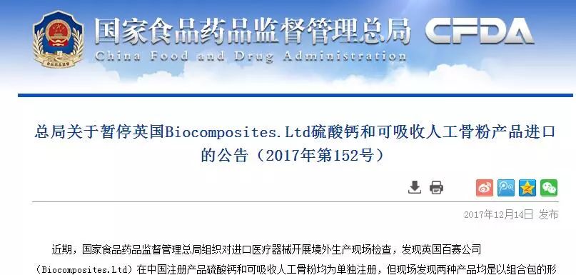 CFDA宣布,自即日起,暫停百賽公司以組合包形式的硫酸鈣和可吸收人工骨粉產(chǎn)品進(jìn)口,并對(duì)相關(guān)案件線索依法組織調(diào)查處理。
