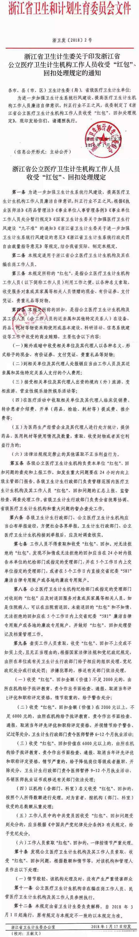 1月24日,行業流傳一份浙江衛計委印發的《浙江省公立醫療衛生計生機構工作人員收受“紅包”、回扣處理規定的通知》(下稱統計,原文見附件)。