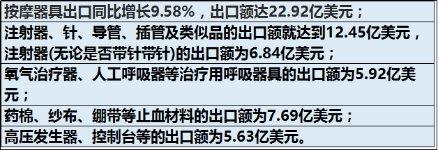而目前我國出口的醫療器械產品中,仍以低值耗材、中低端產品為主,產業對原材料和勞動力等低成本要素依賴很大。以按摩保健器具、醫用耗材敷料為主的前十大出口產品,占據我醫療器械出口總額的44.5%。