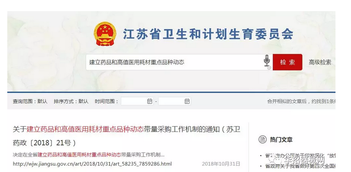 上月底,江蘇省通過新掛牌組建的衛健委官方發布《關于建立藥品和高值醫用耗材重點品種動態帶量采購工作機制的通知》,明確選擇部分藥品和高值耗材品種進行帶量采購。
