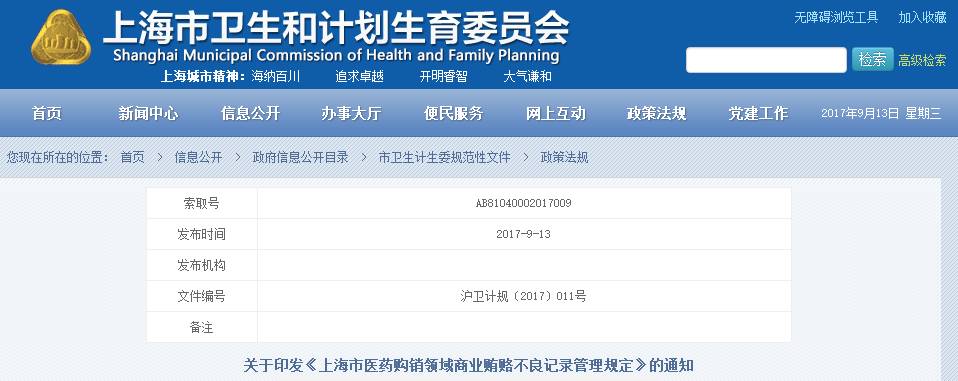 就在昨天,上海市衛計委官網掛出《上海市醫藥購銷領域商業賄賂不良記錄管理規定》(以下簡稱《規定》),規定分5章24條,分別從適用范圍、醫藥購銷領域商業賄賂、不良記錄情形、禁止行為、部門及科室責任、舉報管理、公布管理、涉事個人處理、管理人員處理等24個方面進行了規范。
