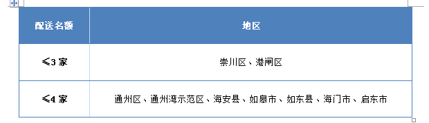 南通規定,同企業的同產品可指定不超過3家配送企業進行配送,為滿足基層配送需求部分地區可增加1個配送名額。征求意見稿中將通州區和通州灣示范區合并視同1個區,只可增加1個名額;正式稿則將兩者解綁,通州區、通州灣示范區可分別增加1家配送企業,各地具體配送名額限制如下: