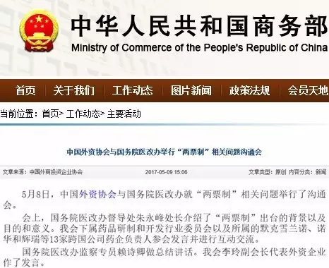 來自商務部的消息,5月8日,中國外資協會與國務院醫改辦就“兩票制”相關問題舉行了溝通會。