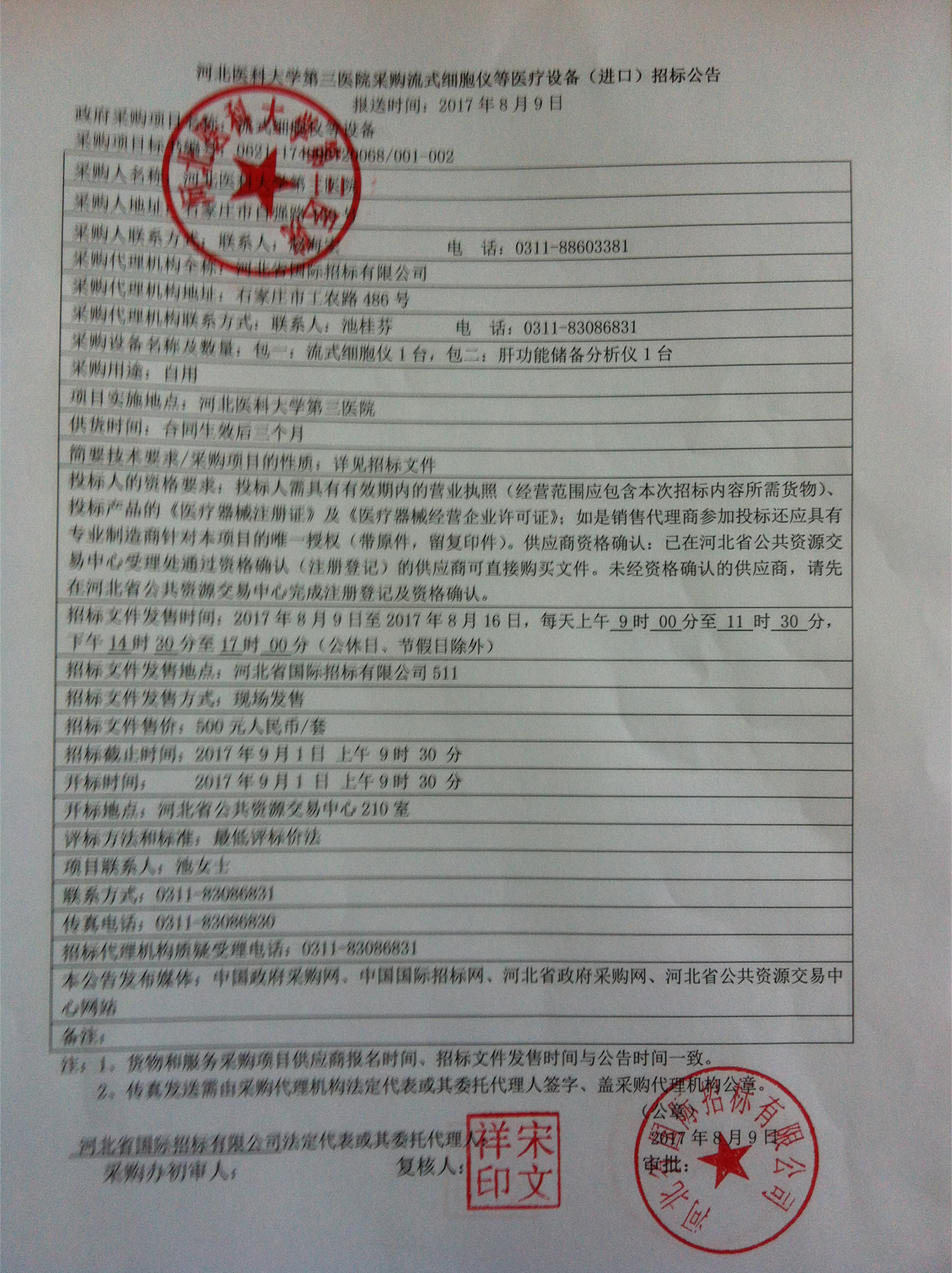 【河北】河北醫科大學第三醫院采購流式細胞儀等醫療設備(進口)招標公告