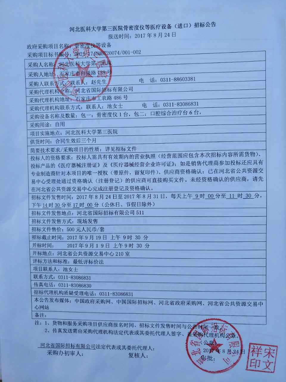 【河北】河北醫科大學第三醫院骨密度儀等醫療設備(進口)招標公告