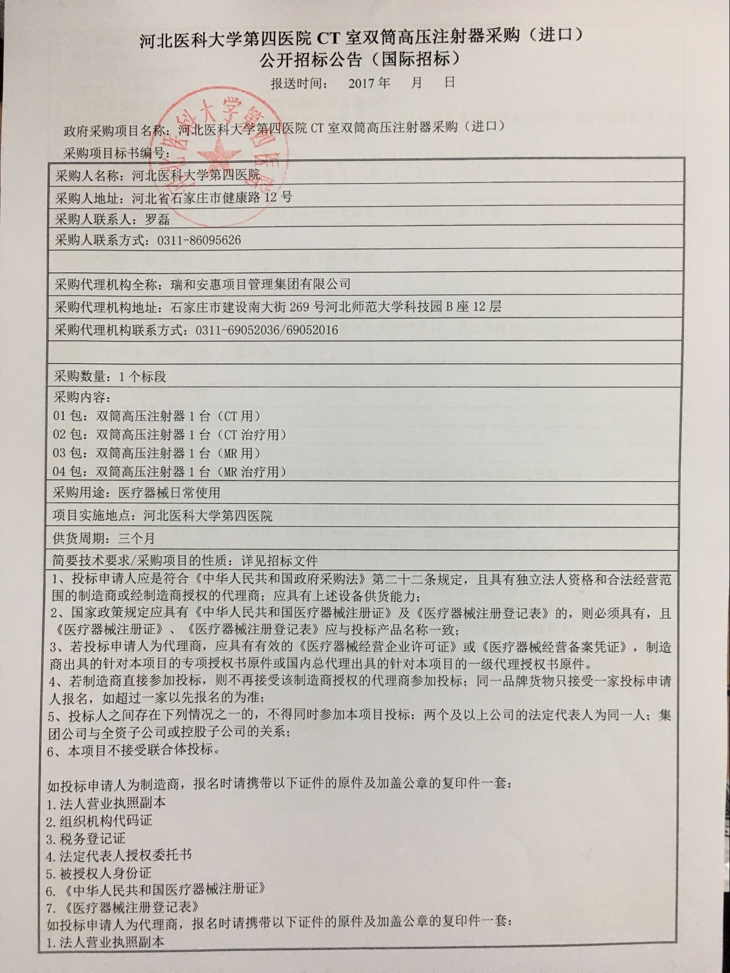 【河北】河北醫(yī)科大學第四醫(yī)院CT室雙筒高壓注射器采購(進口)公開招標公告(國際招標)
